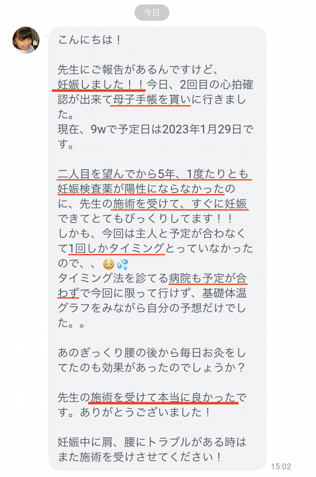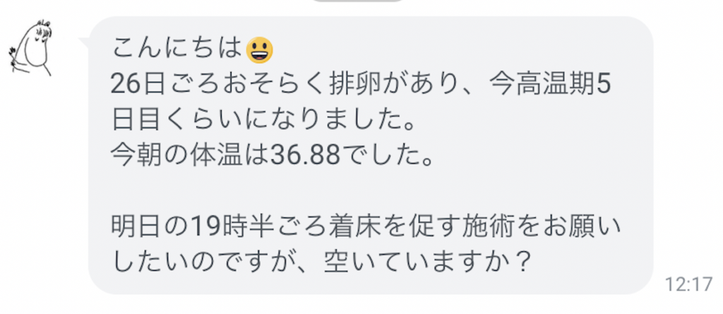 妊娠報告「昨日診察して着床しておりました」「施術はどのあたりで〜」